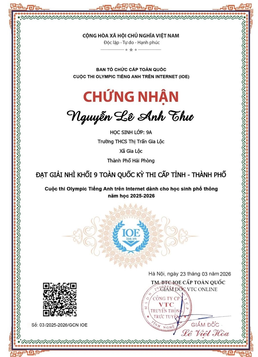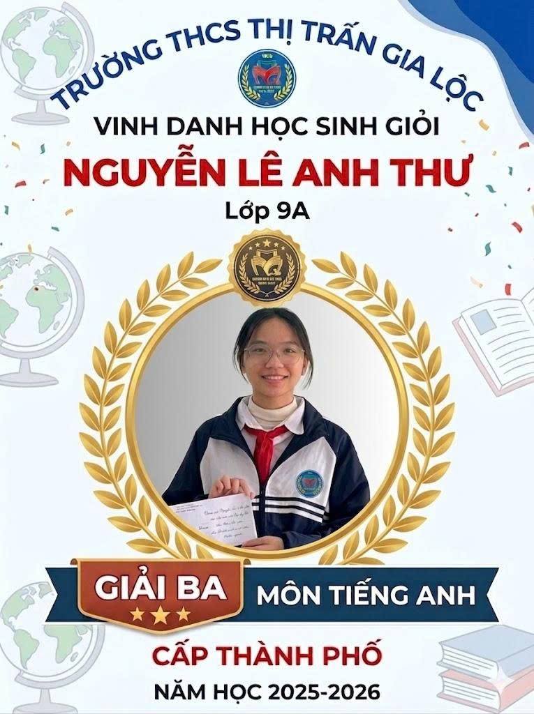 Trường THCS Thị trấn Gia Lộc xin chúc mừng em Nguyễn Lê Anh Thư – học sinh lớp 9A đã xuất sắc đạt Giải Ba môn Tiếng Anh kỳ thi Học sinh giỏi cấp Thành phố năm học 2025–2026, Giải Nhì khối 9 Toàn quốc kỳ thi cấp Thành phố cuộc thi Olympic Tiếng Anh trên Internet năm học 2025-2026, khẳng định năng lực và sự cố gắng không ngừng của bản thân.